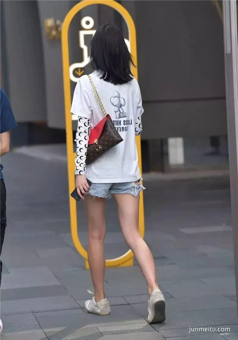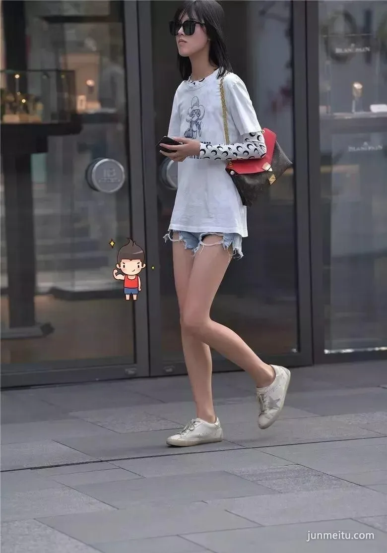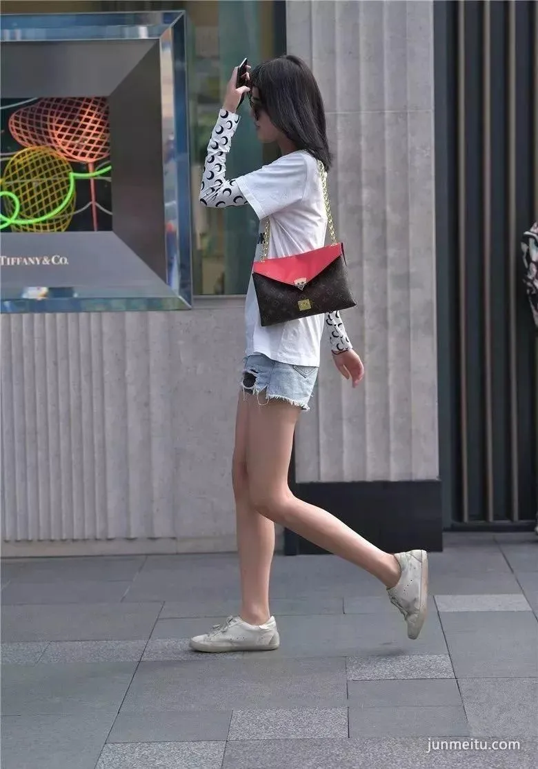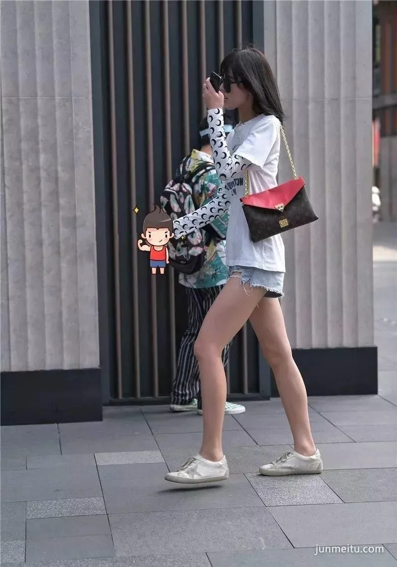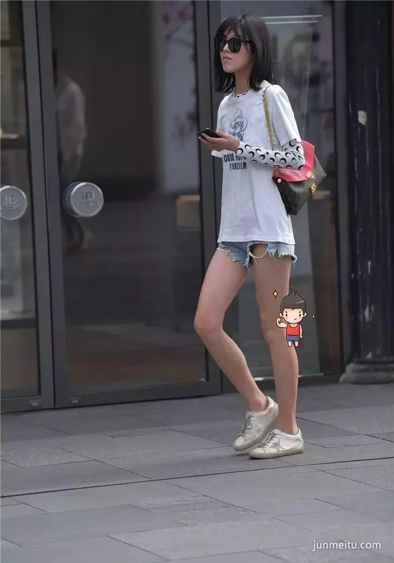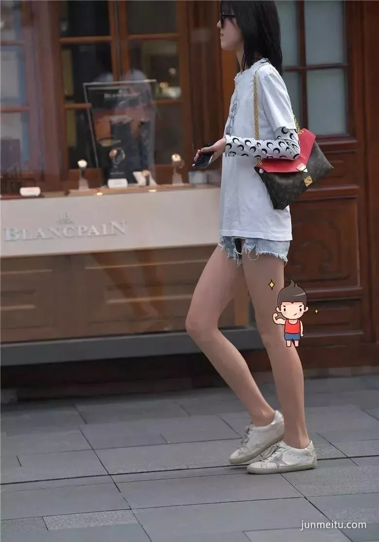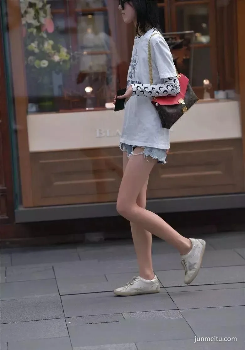 街拍黑色时尚超短裤高挑雪白大长腿气质漂亮妹纸